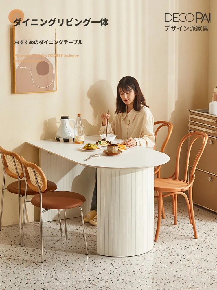 モダンミニマリストのハーフアイランドダイニングテーブル - フランス風の実木ホワイト仕上げ、北欧スタイルの岩板デザインで、小スペースにもぴったり!おしゃれで機能的な家庭用テーブル。