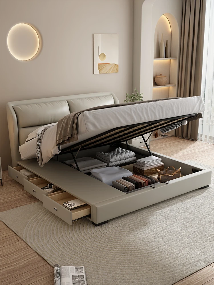 海上云居の本革ダブルベッド - 1.8メートルの主寝室用、収納付き引き出しデザイン、上質なトップグレードの牛革ソフトパッケージ!贅沢な快適さとスタイルを追求した理想の寝室を実現します。