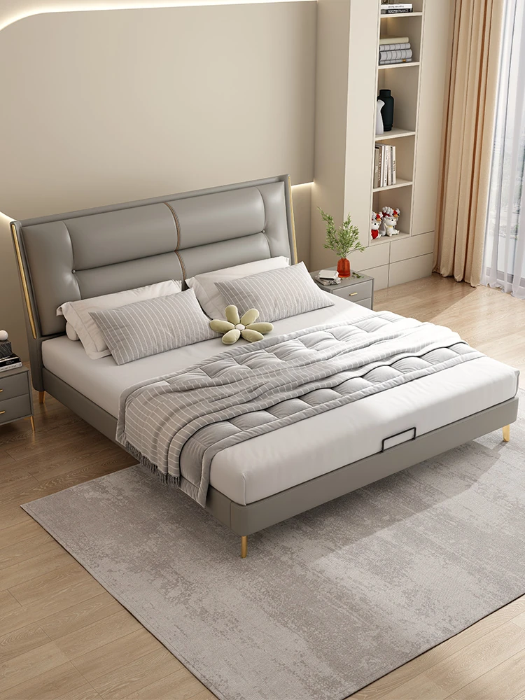海上云居のイタリアンミニマリズム真皮ベッド - 主寝室用 1.8m 牛皮ソフトパッキングダブルベッドで、快適な眠りを体験しませんか?洗練されたデザインと高品質な素材が魅力の大人のためのベッド。