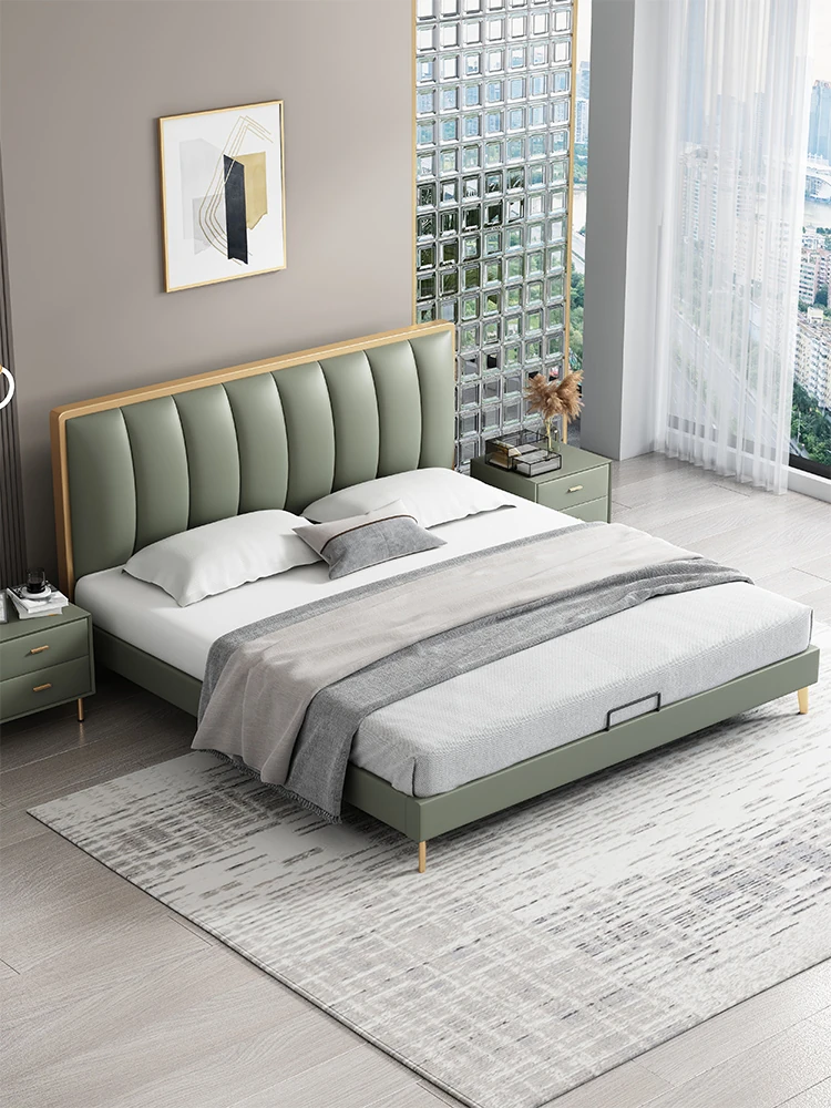 海上云居別荘の本革ベッド|イタリアンミニマリズムデザインの1.8mダブルベッド|主寝室にぴったりな高級牛革婚礼ベッドで、快適な眠りを実現します!