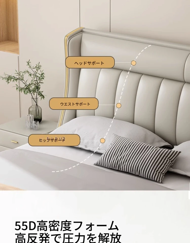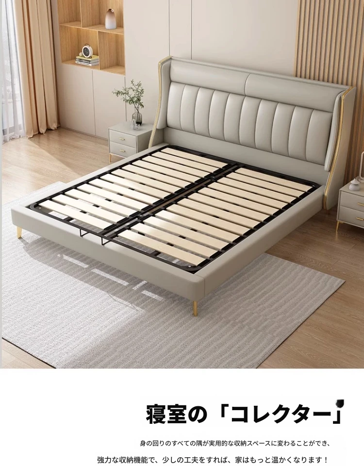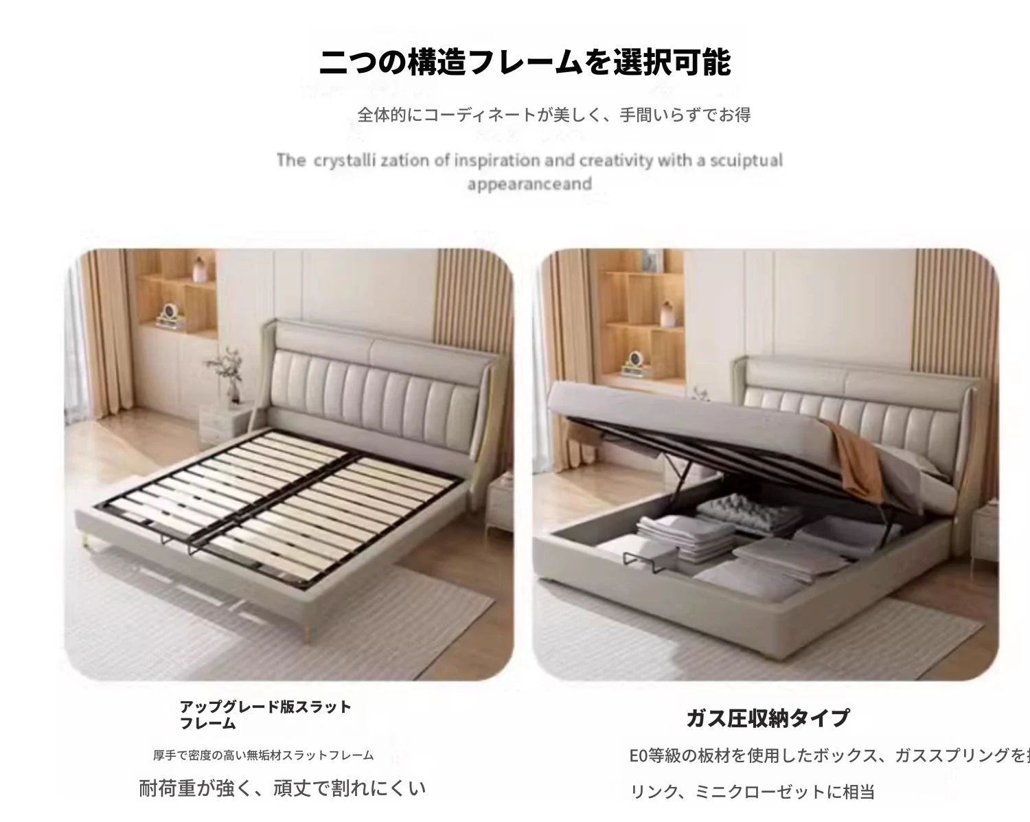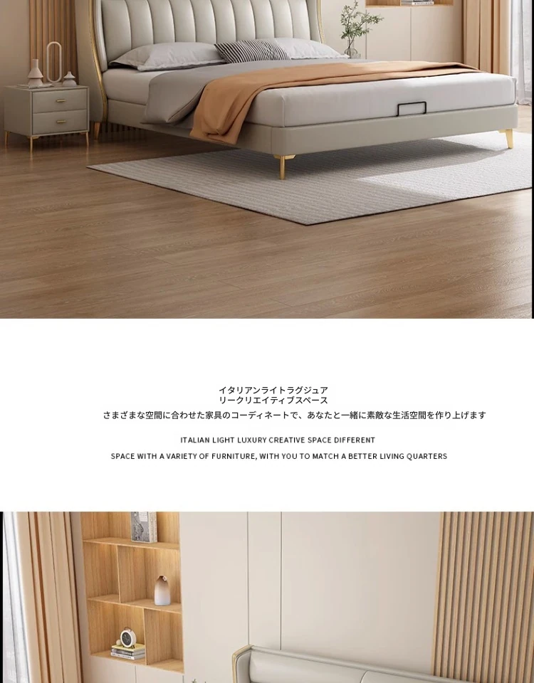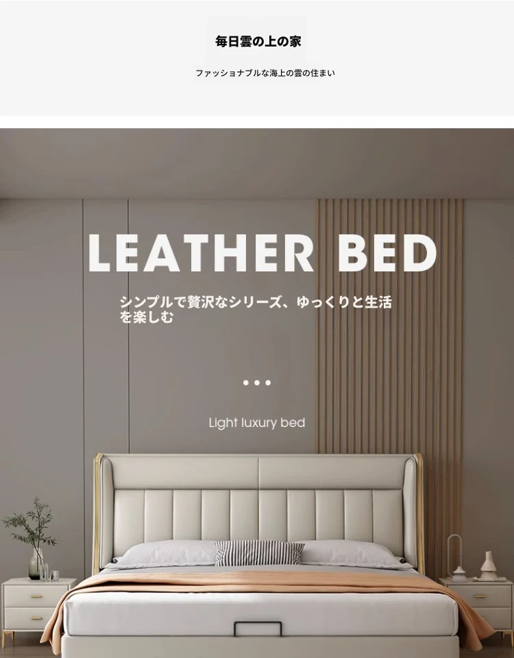 海上云居本革製イタリアンスタイルダブルベッド - 高級牛革ソフトパネル採用、洗練されたデザインで主寝室にぴったりの贅沢な空間を演出!