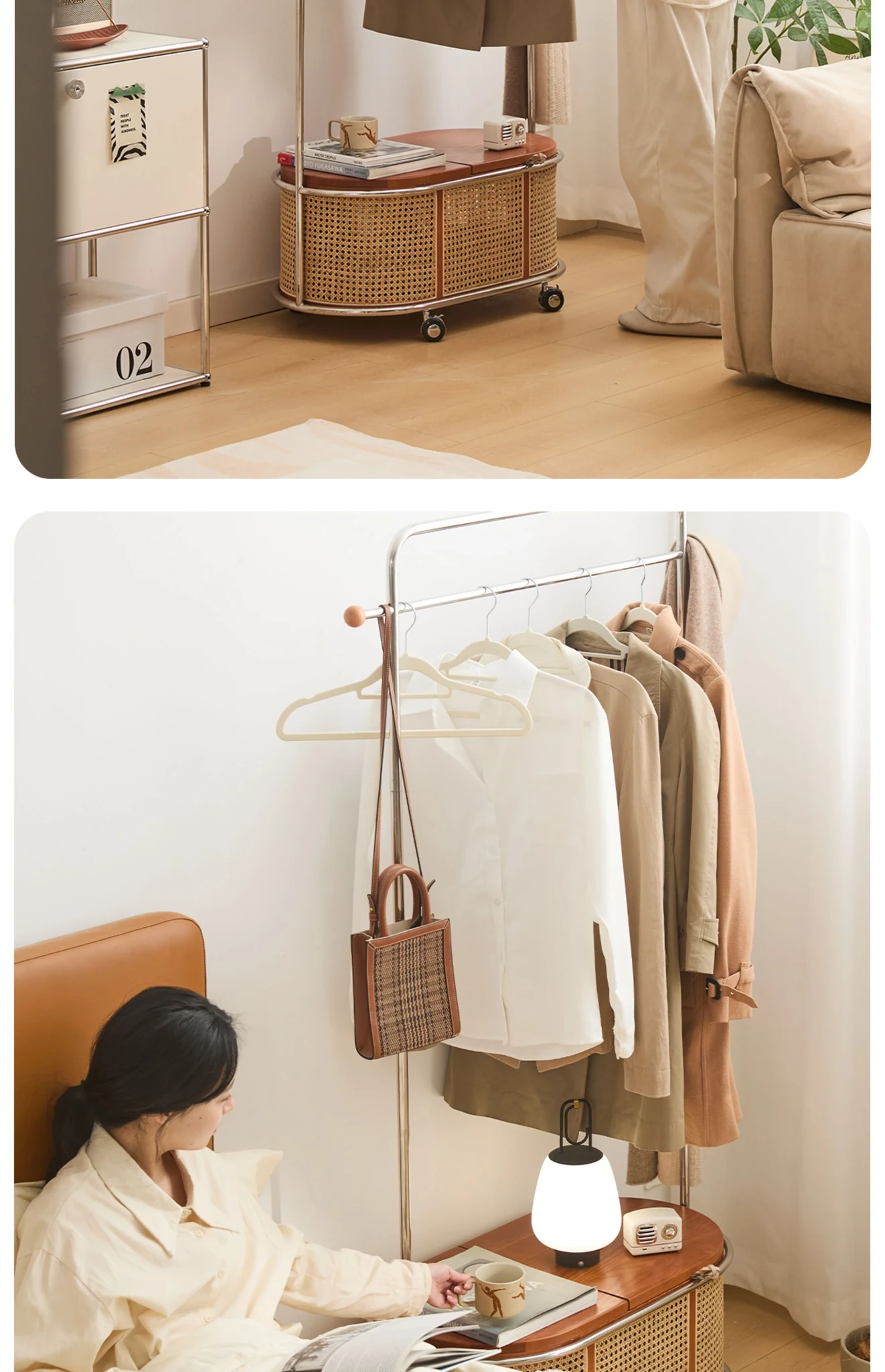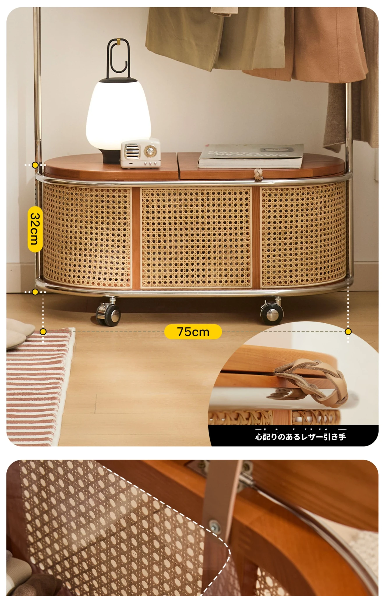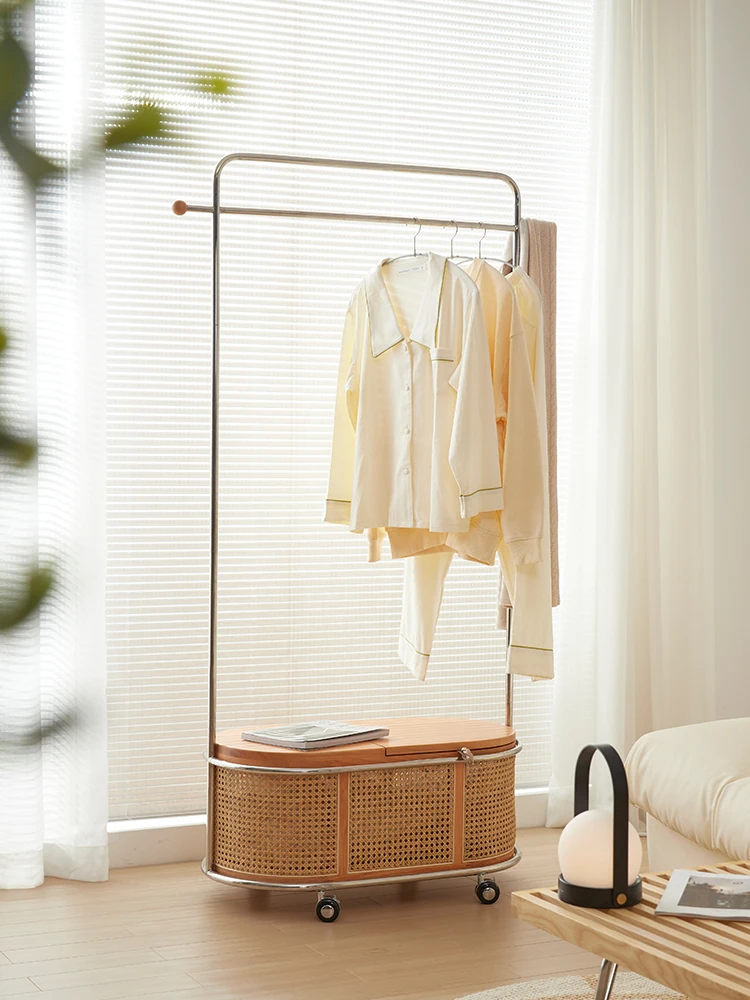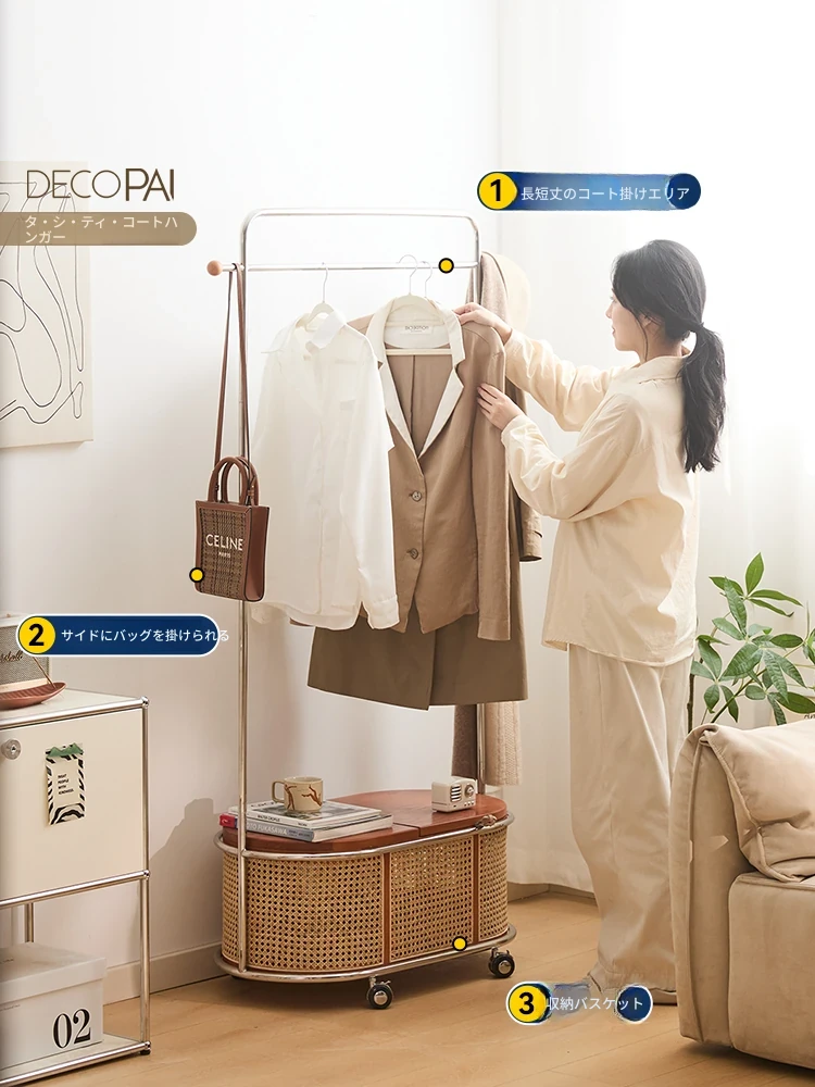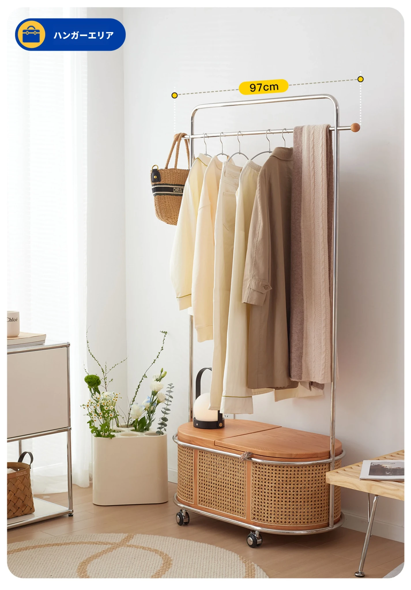 おしゃれな籐編みと無垢材の組み合わせ!シンプルで使いやすいベッドサイドのスタンド型マルチ機能衣類ハンガー。寝室にぴったりの、移動可能なデザインでお部屋をスッキリ整頓!