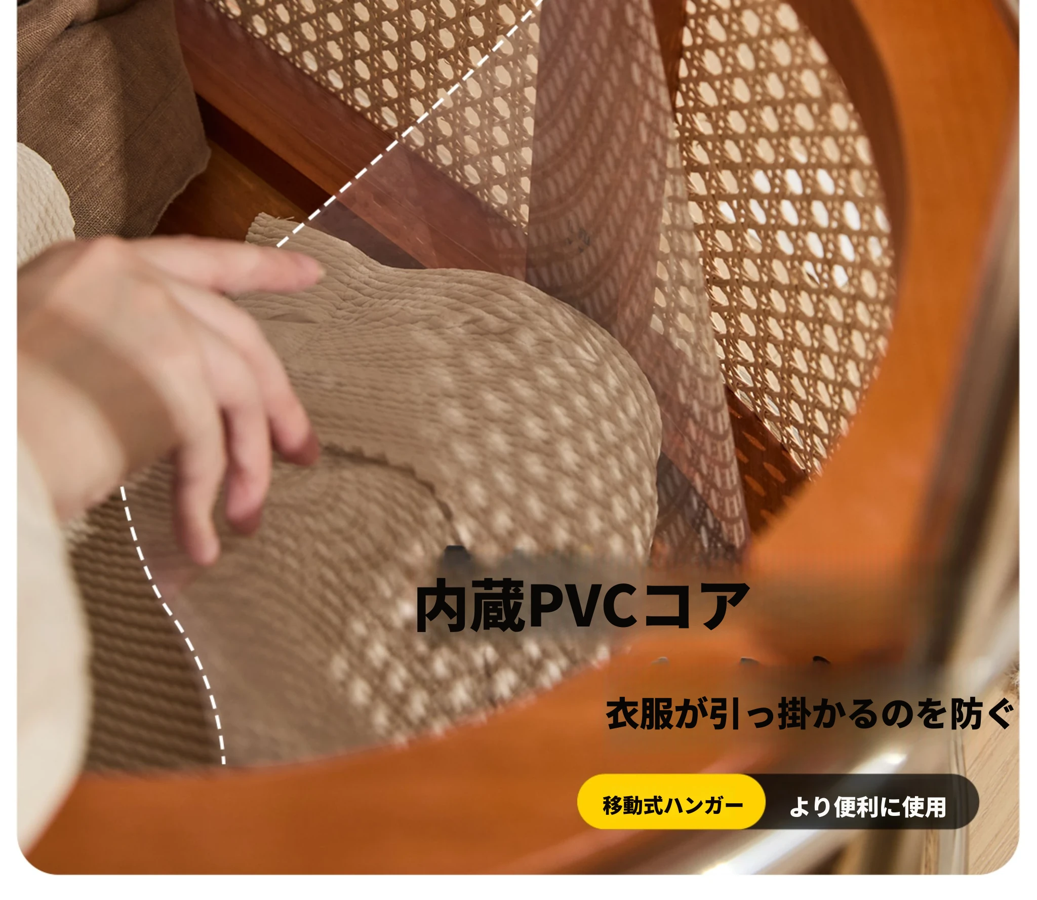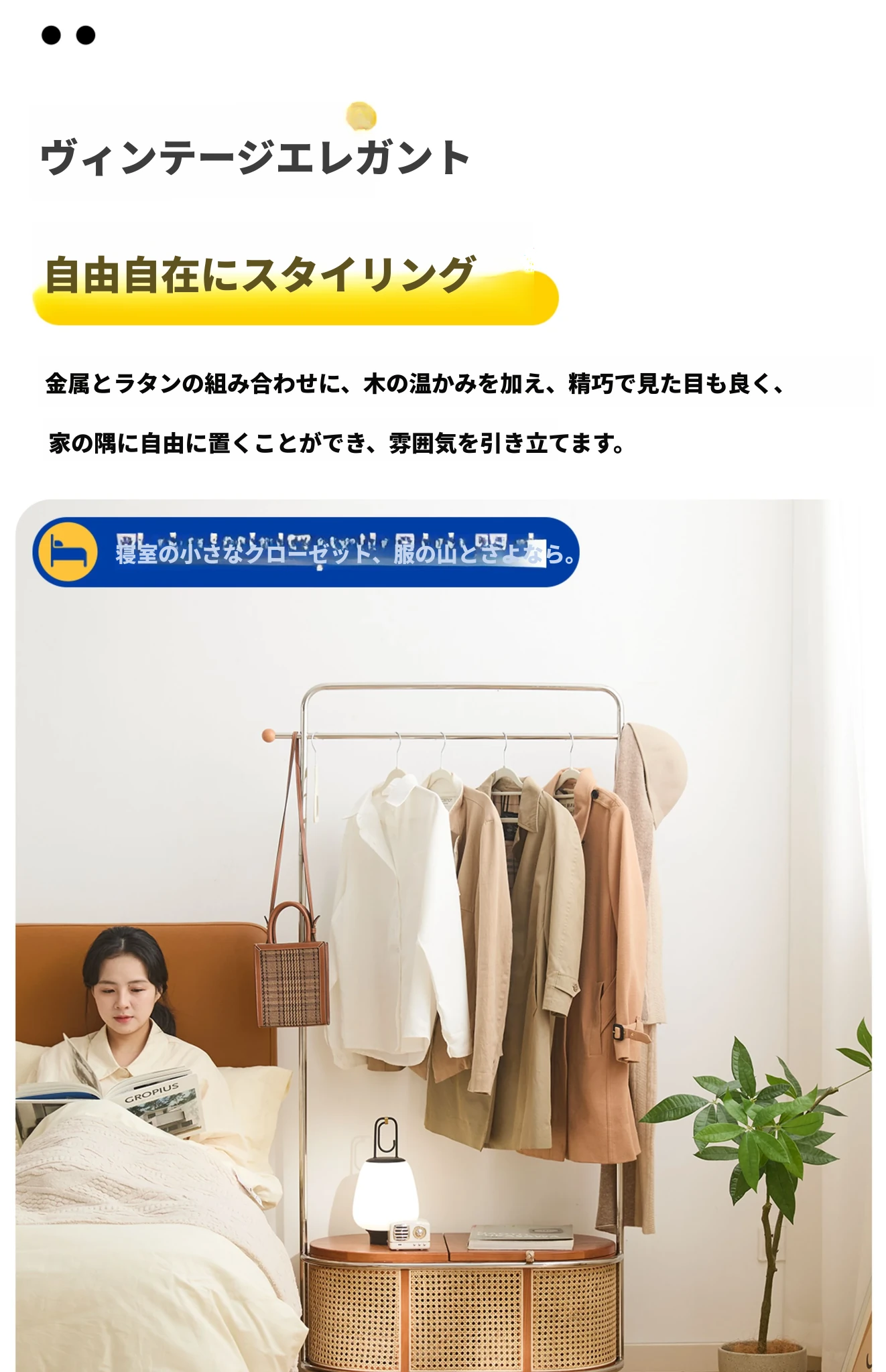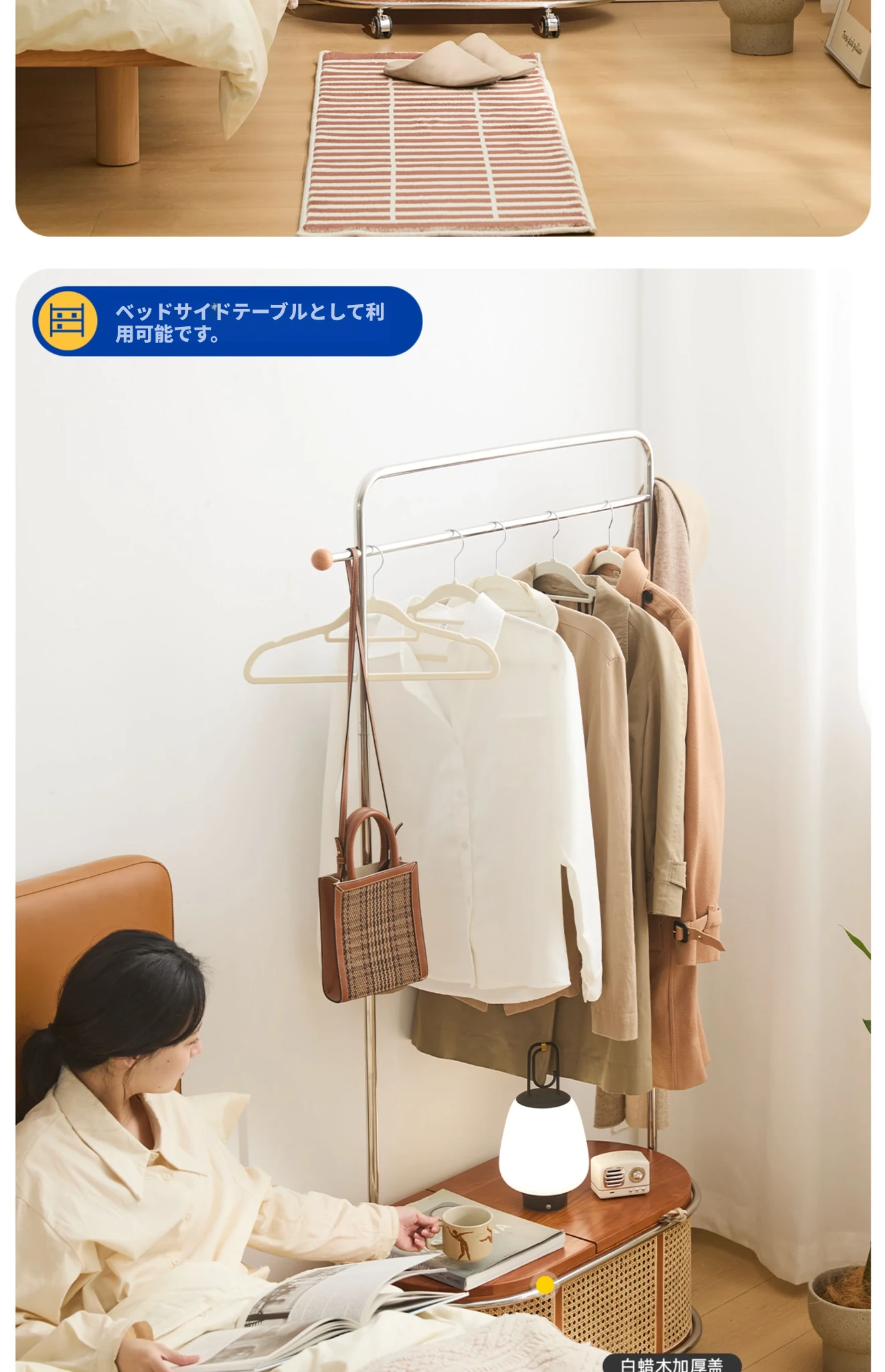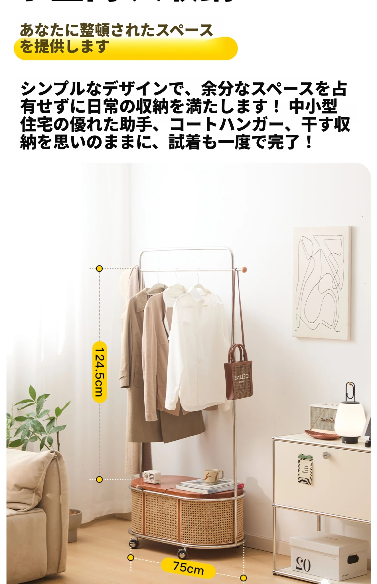 おしゃれな籐編みと無垢材の組み合わせ!シンプルで使いやすいベッドサイドのスタンド型マルチ機能衣類ハンガー。寝室にぴったりの、移動可能なデザインでお部屋をスッキリ整頓!