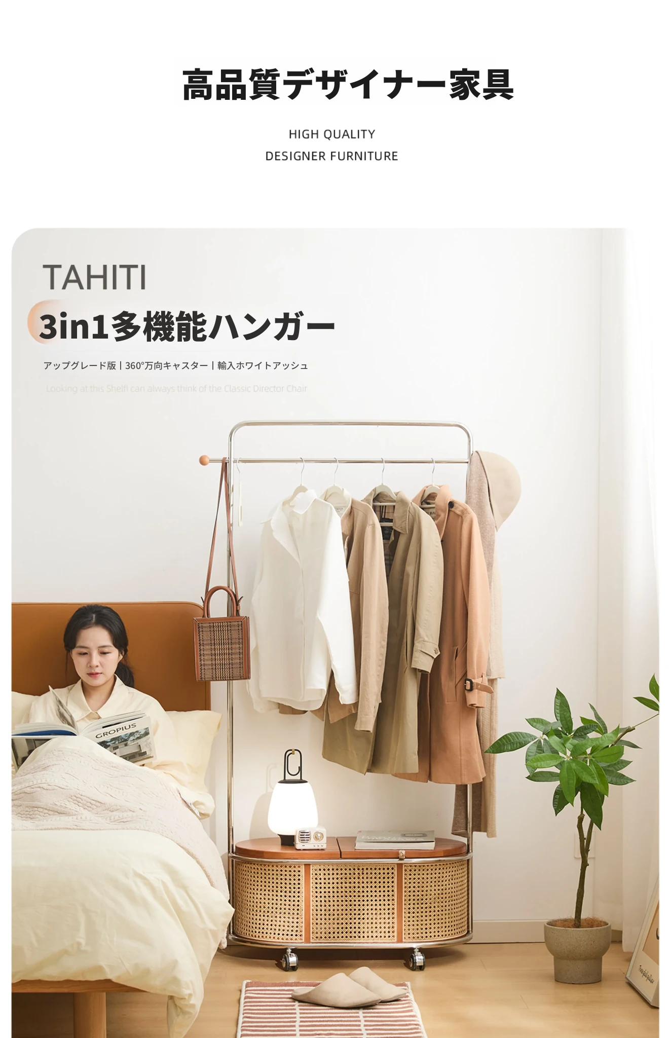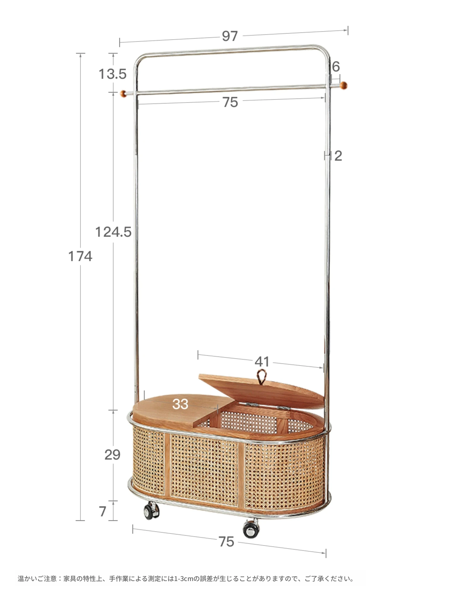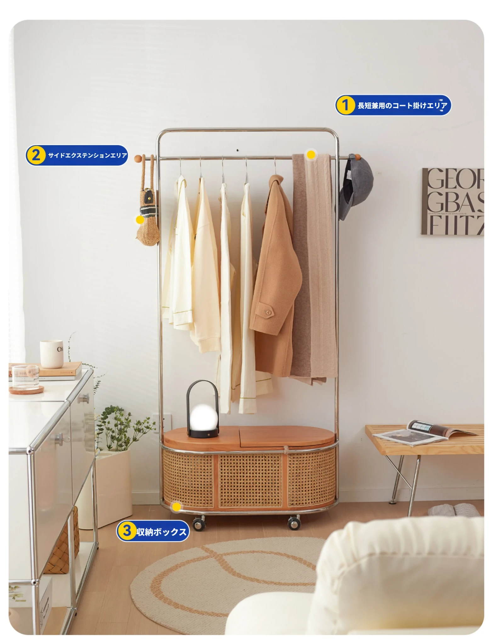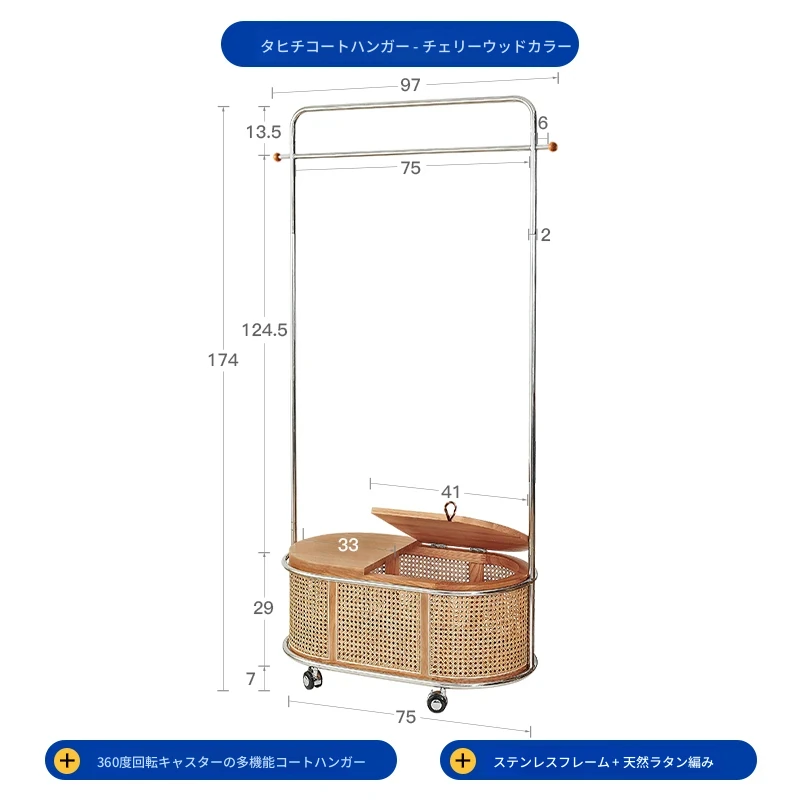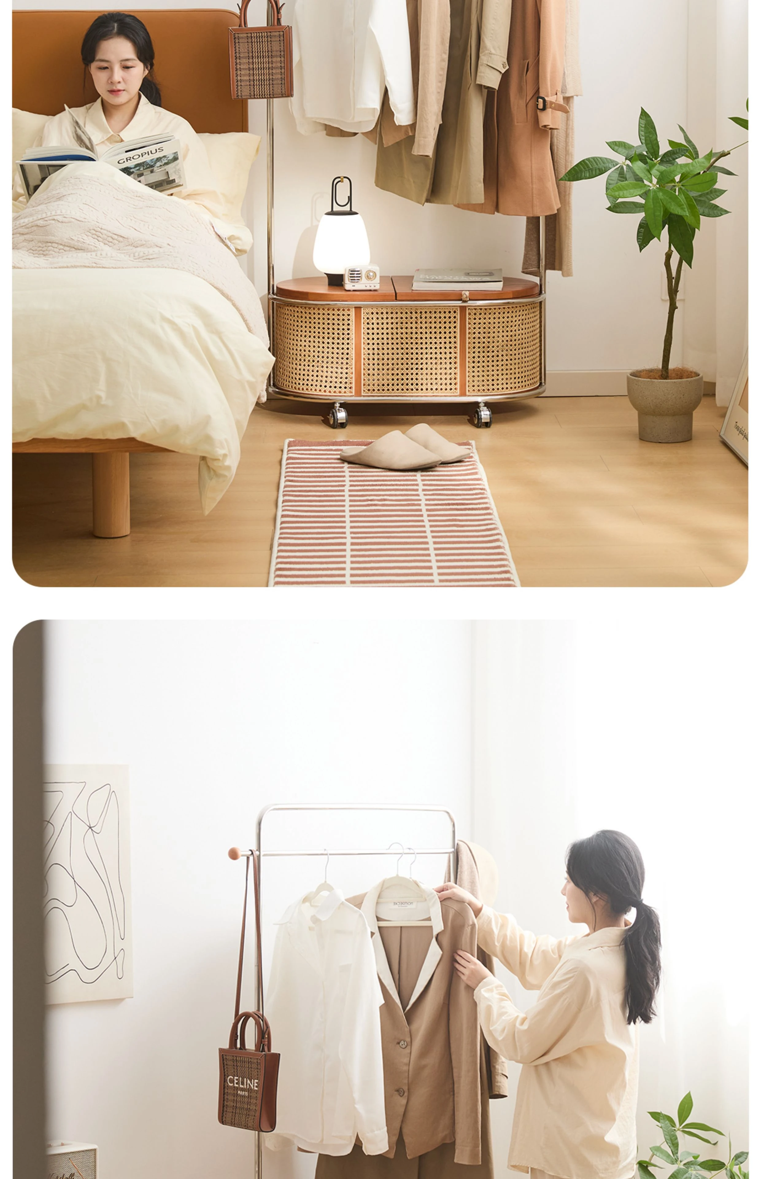 おしゃれな籐編みと無垢材の組み合わせ!シンプルで使いやすいベッドサイドのスタンド型マルチ機能衣類ハンガー。寝室にぴったりの、移動可能なデザインでお部屋をスッキリ整頓!