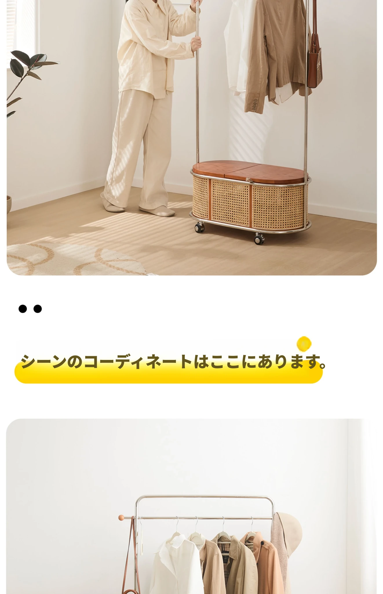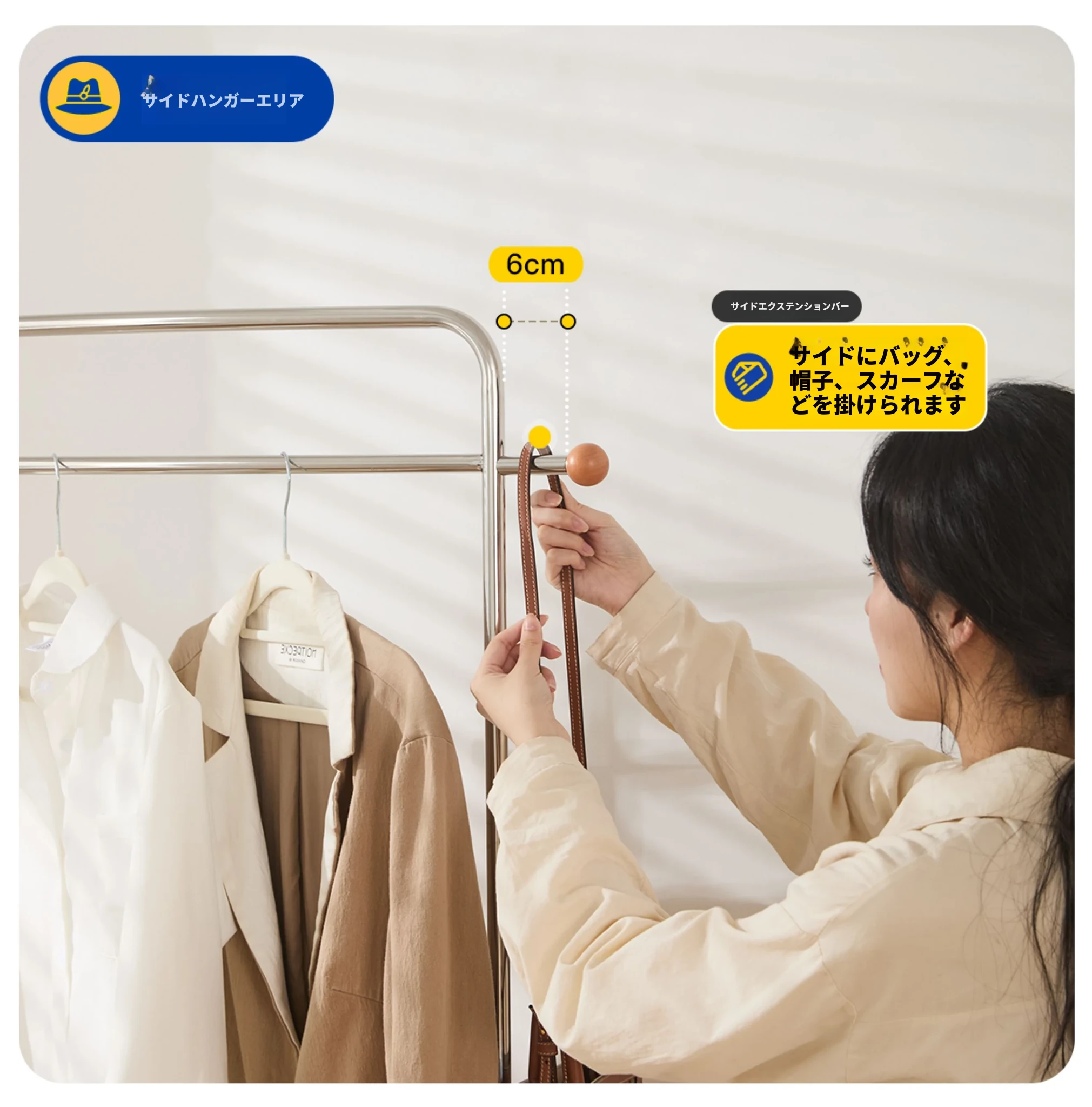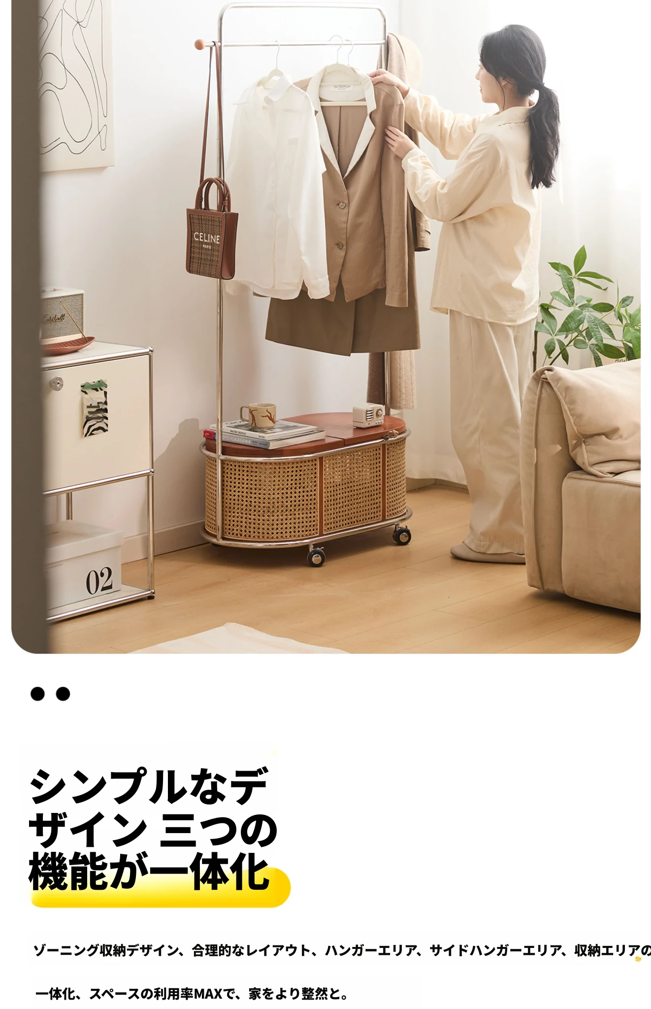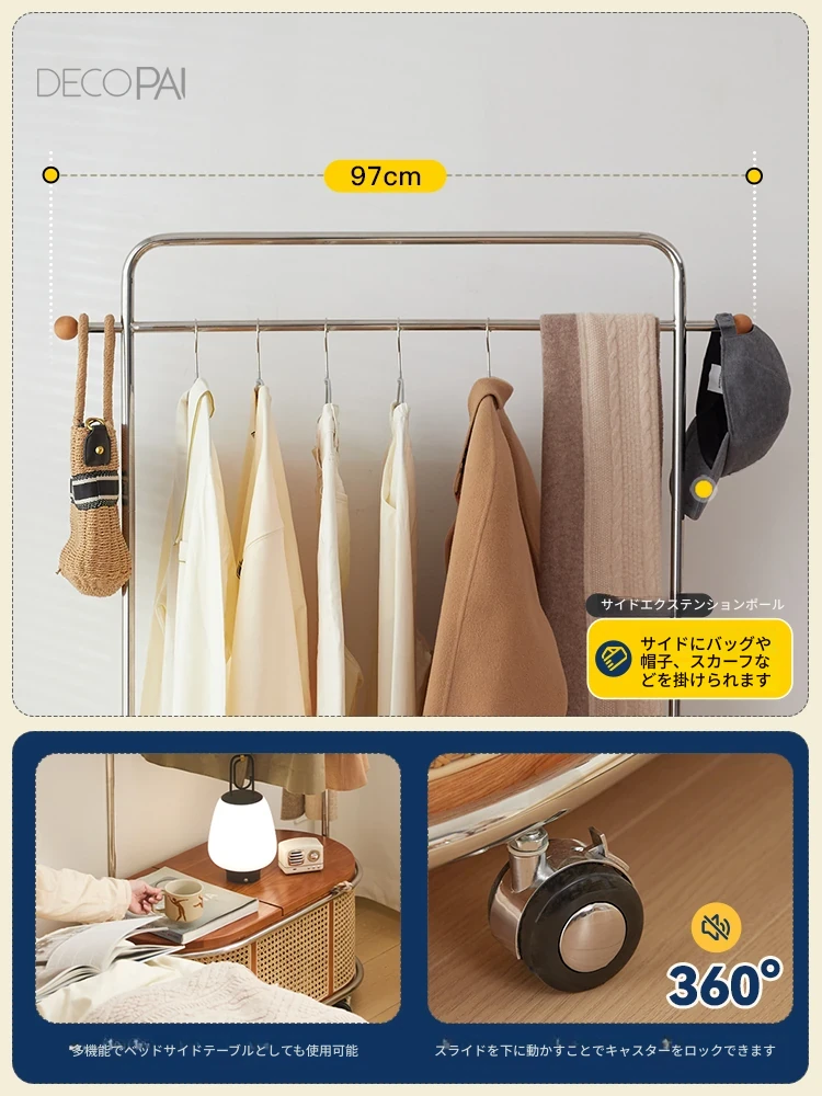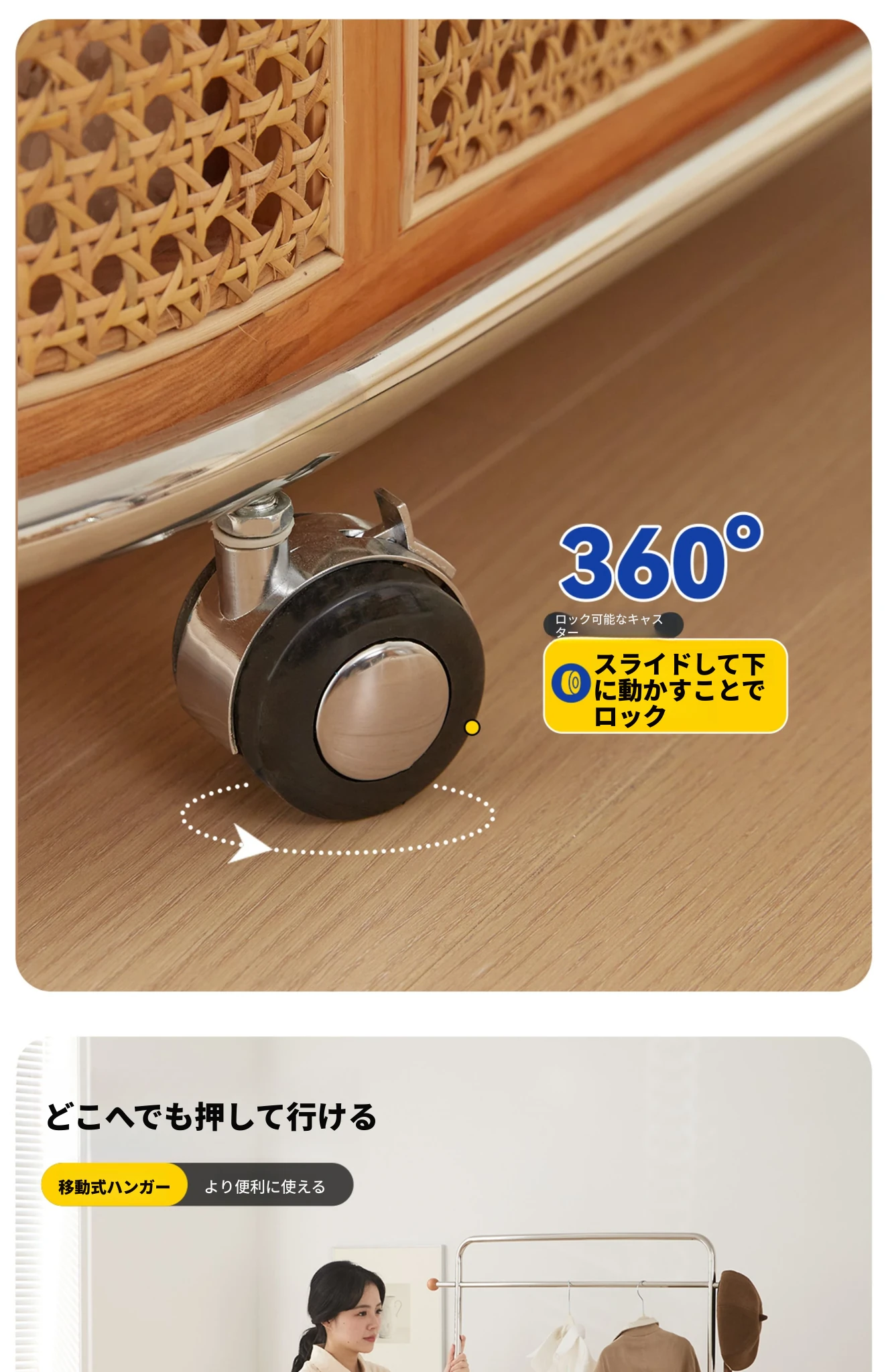 おしゃれな籐編みと無垢材の組み合わせ!シンプルで使いやすいベッドサイドのスタンド型マルチ機能衣類ハンガー。寝室にぴったりの、移動可能なデザインでお部屋をスッキリ整頓!